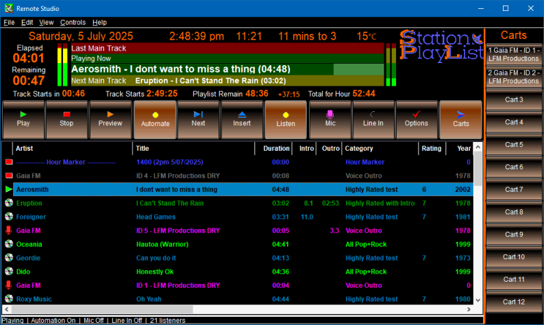 It looks and works almost identically to Studio, but with it's own cart system for instant jingles and sound effects. Note: Remote Studio requires the same version of Studio installed at the station. |